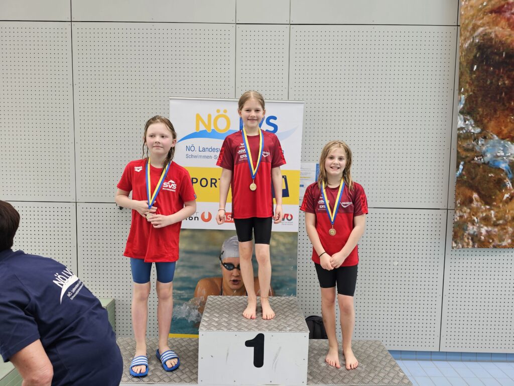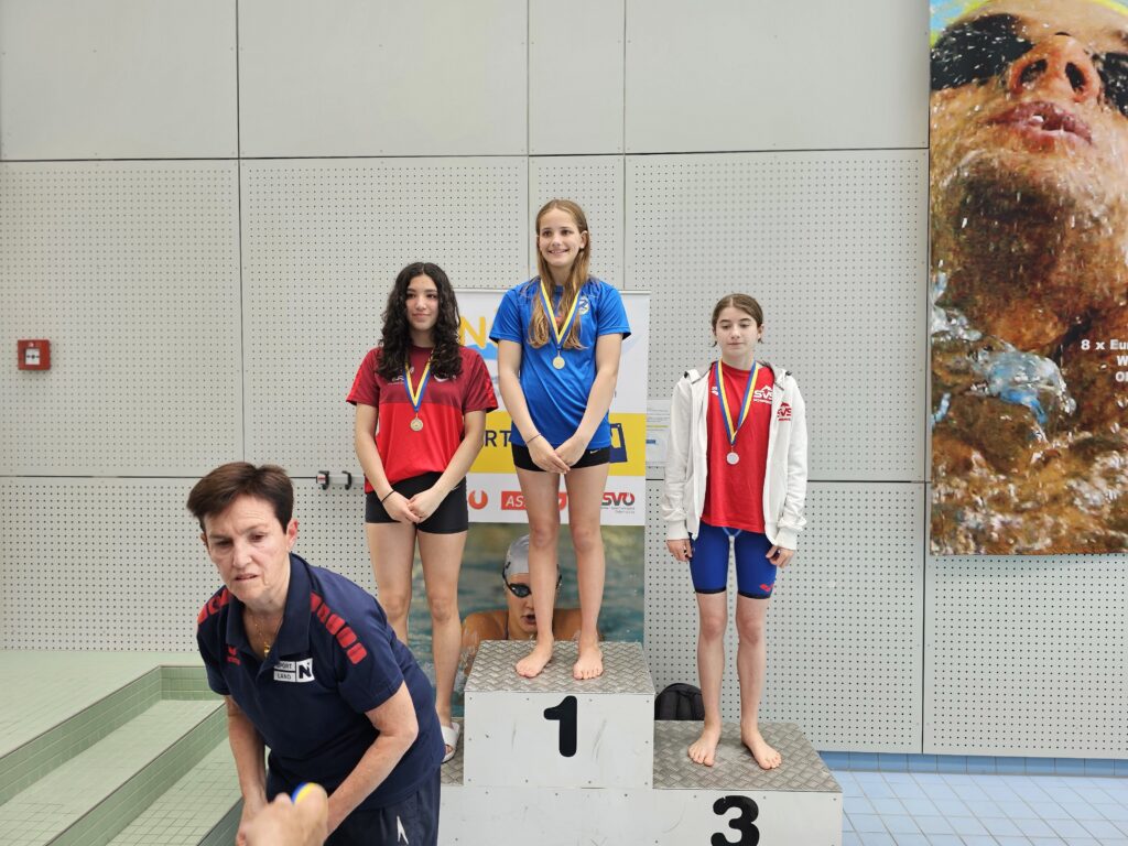 Für die dritte Goldmedaille sorgte Juliana Strambach über 200 Meter Freistil in der Altersklasse Schüler 2. Zusammen mit Vereinskollegin Louisa Bader und Emily Krois vom SVS Schwimmen lieferte sich das Trio ein Kopf-an-Kopf-Rennen im Becken, bei dem fast bis zum Schluss keine klare Entscheidung erkennbar war. Louisa Bader musste sich erst im Finish geschlagen geben, durfte sich aber dennoch über die Bronzemedaille freuen. „Es war richtig toll bei diesem Lauf mitzufiebern! Besonders freut mich, dass Louisa mittlerweile an der Spitze des Jahrgangs 2013 angekommen ist, und unsere Mädls in Zukunft der Konkurrenz richtig Druck machen werden“, so ASV2000-Trainer Chris Strambach.