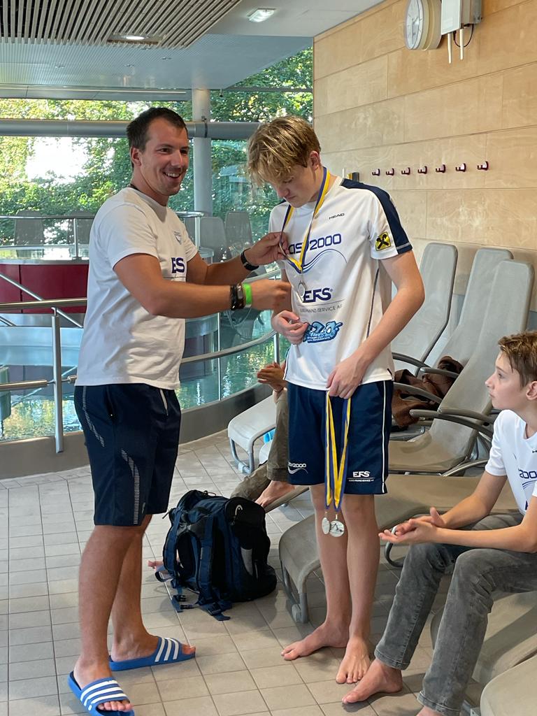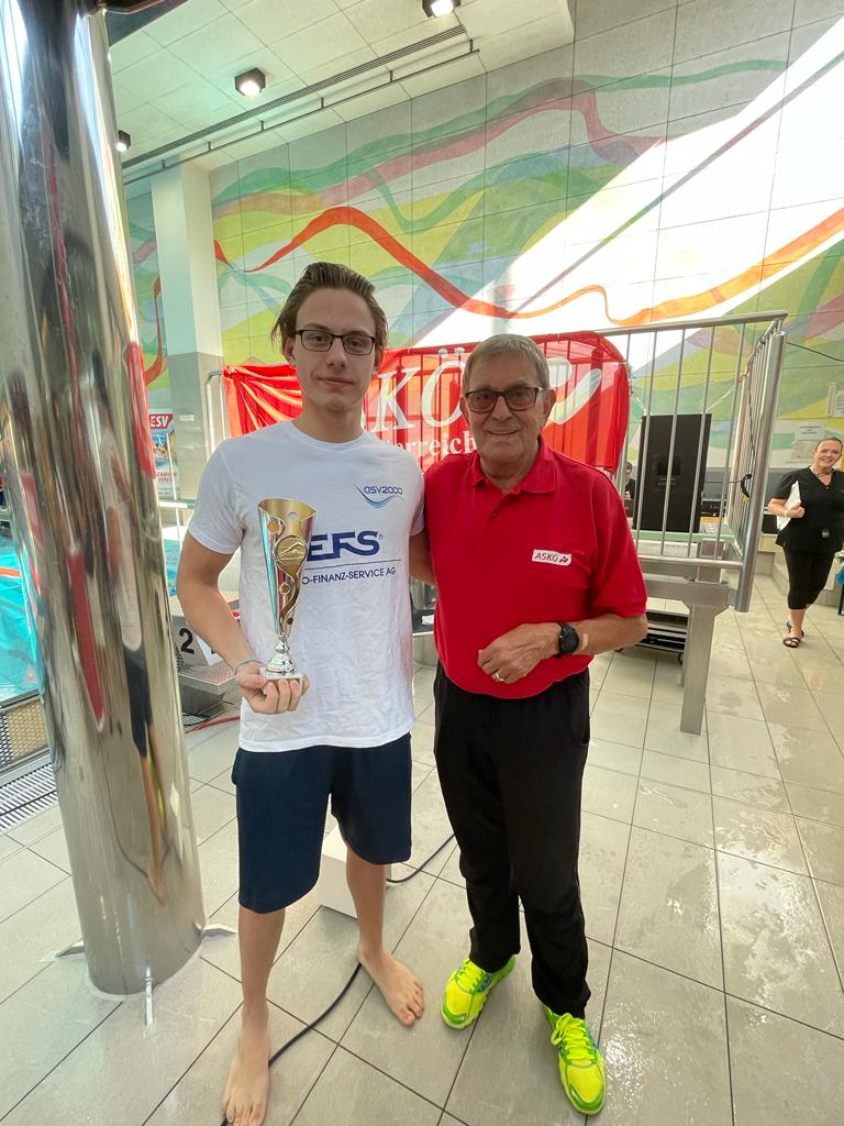 Insgesamt fünf Goldmedaillen und Landesmeistertitel sicherte sich Sebastian Giefing (Jg.2004), da er in der Wertung sowohl in der Allgemeinen Klasse als auch in seiner Altersklasse der Junioren die schnellste Zeit schwamm. Außerdem belegte er noch zwei Mal den zweiten Platz und wurde für seine Gesamtleistung mit einem Pokal ausgezeichnet.