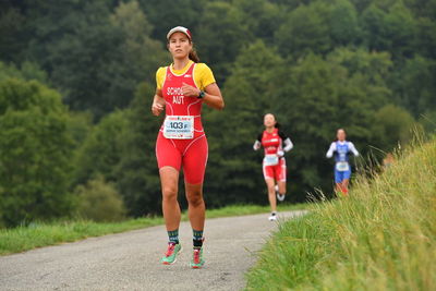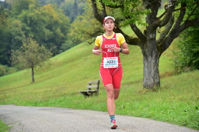 Wenn da nicht noch das Laufen wäre: 30 Kilometer, drei Runden, dreimal den Anstieg durch den Wald auf die Anhöhe hinauf. Schnell wieder eine Überschlagsrechnung gemacht – nein der Vorsprung kann für einen 30 Kilometer-Lauf nicht reichen. So schnell gibt man aber auch nicht auf und daher galt es zu rennen – zumindest bis man eingeholt wird. Das Laufen ging überraschender Weise sehr gut und schneller als geplant und der Abstand nach hinten blieb unverändert. Erst nach 20 Kilometer (also gesamt gesehen 30 Laufkilometern) meldeten sich die Beine. Kurze Gehpause bei der Labe, kurze Meldung des Betreuers: „Laufen! Immer Laufen!!“ OK