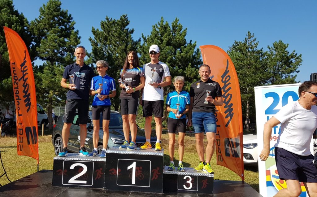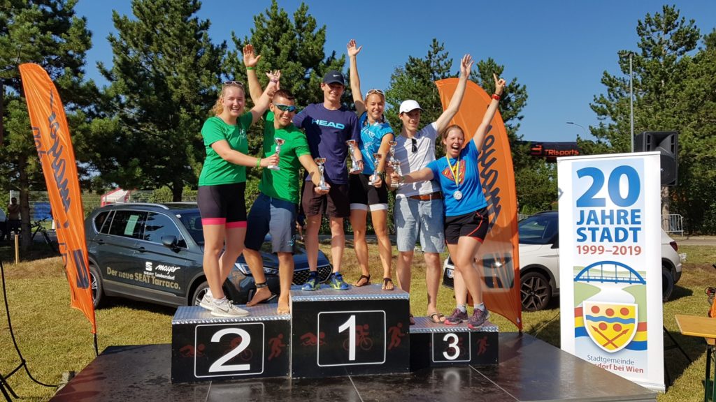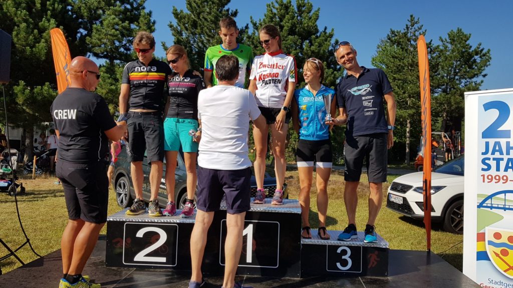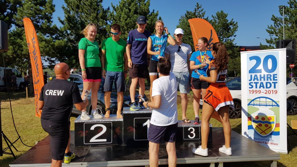 Am Nachmittag warfen sich die restlichen drei ASV-Athleten über die Sprintdistanz in den Gerasdorfer Badeteich. Vicky Kneissl, nach längerer Verletzungspause wieder im Aufwind, gewann mit 1:06:10 Stunden die W-U23 und ließ damit auch die restlichen Vereinskollegen hinter sich. Roland Kneissl bemüht, den Nachwuchs nicht ganz abreißen zu lassen, erkämpfte sich mit 1:07:19 Stunde den zweiten Platz in der Altersklasse M-MK50. Gemeinsam errangen die Beiden damit auch den dritten Platz in der Er & Sie-Wertung. Nur Sekunden dahinter erlief sich mit 1:07:31 Stunden Harald Peterka den achten Platz in der Altersklasse M-MK35.