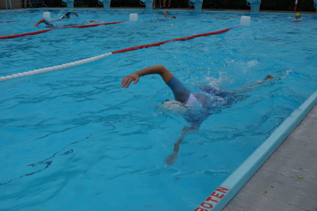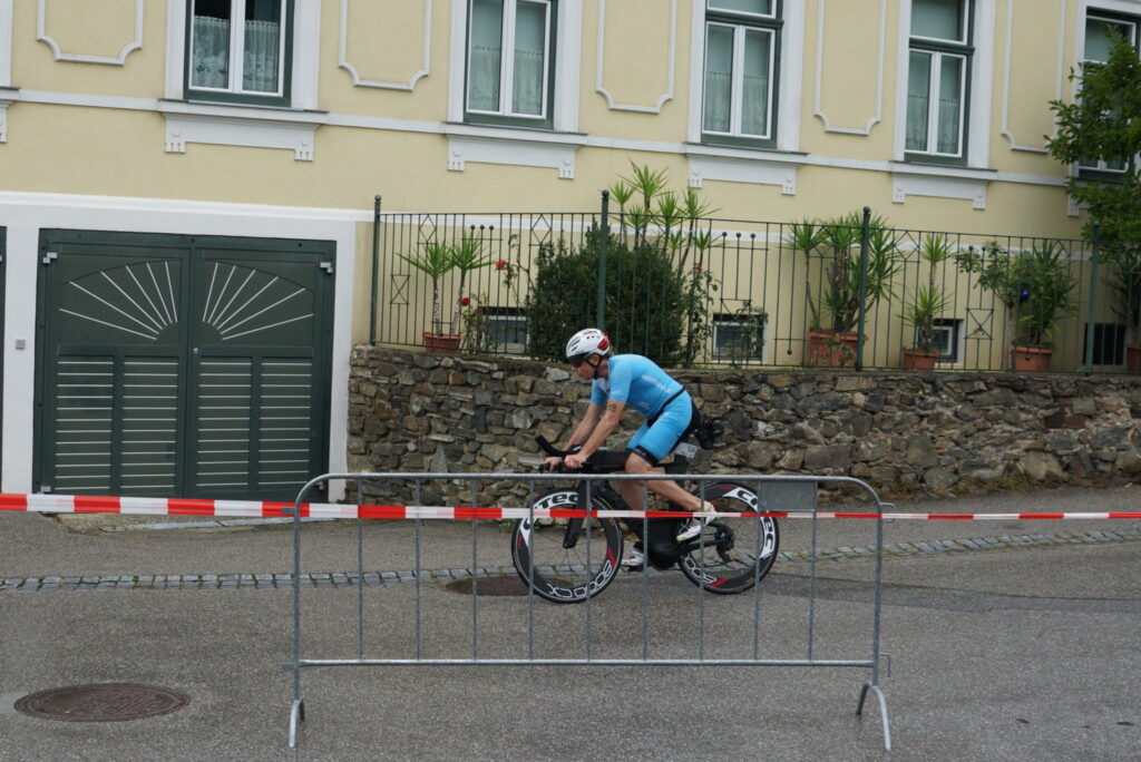 Zu Beginn galt es 300 Meter (neun Längen im Becken des Freibades) zu schwimmen. Die Startreihenfolge wurde nach der genannten Endzeit fixiert. Als Helmut ungefähr die Hälfte der Schwimmstrecke absolviert hatte, öffnete der Himmel seine Schleusen. Somit hieß es die 20 Kilometer mit dem Rad von Schönberg am Kamp nach Straß im Straßertale und über Hadersdorf am Kamp retour dosiert zu fahren. Stellenweise war es auf der Straße ziemlich rutschig. Zum Abschluss mussten noch drei Runden zu je 1,66 Kilometer gelaufen werden. Da hatte es dann zumindest zum Regnen aufgehört 😉
