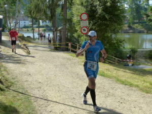 Die Laufstrecke ist genauso selektiv wie die Radstrecke. Man läuft hauptsächlich auf Waldstrecken. Asphalt kommt nur unter die Füße, wenn man am Hauptplatz/Zielbereich vorbeiläuft. Vier Runden waren zu laufen (gesamt 21 Kilometer) und nach der Zweiten dachte ich, WARUM kann ich nicht schon jetzt ins Ziel laufen?!?! Es war warm/heiß, gefühlte 40° C, die Zeit war auch schon vorangeschritten und die mentale Stärke ließ merklich nach. Die dritte Runde kämpfte ich mich durch und dann war das Ziel wieder greifbar. Ich motivierte mich aufs Neue mit dem nun baldigen Zieleinlauf und begann mit der vierten Runde. Ich sah einen Läufer circa 200 Meter vor mir, auf den ich bald aufschließen konnte. Aus einem kurzen Wortwechsel sollte letztendlich eine gemeinsame, die finale Laufrunde werden. Bernhard und ich zogen uns gemeinsam ins Ziel und überwanden alle mentalen und körperlichen Tiefs zu zweit. Im Ziel hatten wir beide ein sehr großes Lächeln im Gesicht stehen und wir waren beide stolz und zufrieden in 5 Stunden 48 Minuten die Ziellinie überquert zu haben. Ein einzigartiger Tag ging zu Ende!