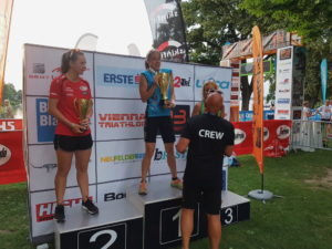 An diesem sensationellen Bewerbswochenende in Neufeld schaffte Vicky Kneissl ihren ersten vollen Erfolg in einem Triathlonbewerb. Sie gewann die Sprintdistanz am Neufelder See in einem heiß umkämpften Finish in der Zeit von 1:10:46,14 Sekunden vor Anja Schrettner vom ATUS Knittelfeld. Nur fünf Sekunden dahinter auf dem dritten Platz landete Anita Schoderbeck vom URC Sparkasse Langenlois. Vicky bescherte dem ASV TRIA Stockerau damit den vierten Gesamtsieg in seiner Vereinsgeschichte. Nach den Erfolgen von Jacqueline Kallina 2016 in Gerasdorf und Trum, sowie 2014 in Neufeld. Frei nach Mister Songcontest Andi Knoll könnte man sagen: „Jetzt hat uns die den Schas gwonnen“. Sie bestätigte damit Ihre hervorragende Leistung bei der Staatsmeisterschaft in Tulln vom vergangenen Wochenende, bei der sie den 21. Platz von 53 Starterinnen erringen konnte. Die Formkurve zeigt also steil nach oben.