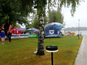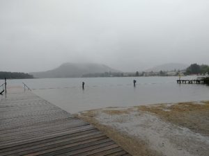 Aufgrund der Wetterwarnung mussten die Veranstalter die Schwimmstrecken am Samstag ändern und verkürzen 🙁 Aber Sicherheit geht vor! Die Schwimmstrecke der Mitteldistanz wurde nicht um die Insel geführt, sondern vom Gemeindestrandbad in Faak am See zur Insel und wieder retour. Ein kurzer Landgang und auf zur zweiten Runde. Somit waren statt 3.800 Meter nur 3.000 Meter zu schwimmen.