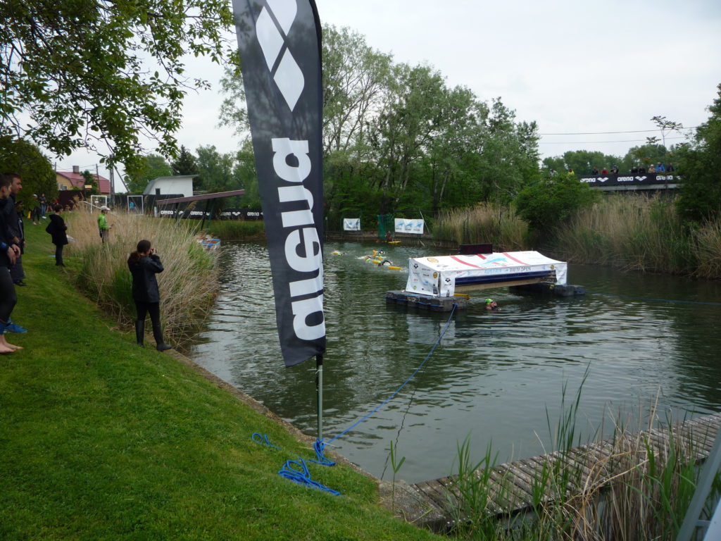 Zuerst ging es durch einen schmalen Kanal, der einen von der Alten Donau ins Kaiserwasser bringt. Dort schwamm ich recht weit auf der Seite fast schon über die Bäume kriechen, die dort am Ufer im Wasser lagen. Ich hatte schon Angst mir meinen Neopren aufzustechen. Dann als wir im tatsächlichen Kaiserwasser waren schwammen wir in Richtung erster Boje. Da hatte ich schon bald alle zu überholenden überholt und merkte auch bald, dass nur mehr sehr wenige vor mir waren. Ich versuchte mit denen mitzuschwimmen, konnte beziehungsweise wollte das Tempo aber nicht halten, da das ja für mich in erster Linie ein Open Water Test war. Bei der ersten Boje ging scharf rechts herum. Da versuchte ich so gut wie es geht zu erblicken, wie weit die nächsten hinter mir waren. Zu meinem Erstaunen war es schon ein recht großer Abstand. Ich bemerkte auch, dass neben ein Wasserretter auf einem Board uns begleitete. Daraus schloss ich, dass ich sehr weit vorne im Feld sein musste. Am Rückweg zur nächsten Boje versuchte ich in erster Linie nicht so weit zurückzufallen, dass ich nicht vom Weg abkam sondern mich an meinem Vordermann orientieren konnte. So ging es dann wieder zurück. Das Ziel befand sich dann nach einer 180 Grad Kurve auf der linken Seite. Man musste durch ein Tor im Zaun schwimmen und dann noch ein paar Meter bis zum Ziel. Das Ziel war ein Querbalken, unter dem man durchschwimmen und mir der Hand anschlagen musste um die Zeitnehmung auszulösen.