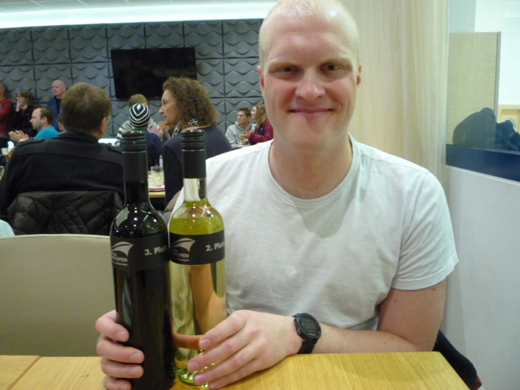 Ich musste zweimal hinaus und bekam als Trophäe einmal eine Flasche Weißwein und einmal eine Flasche Rotwein.